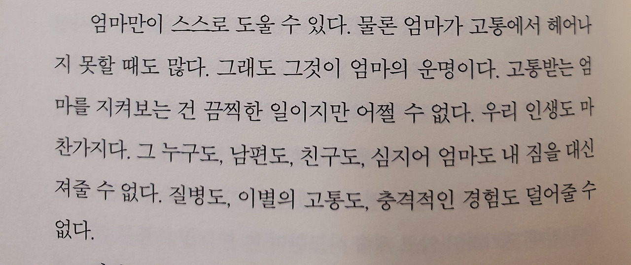 인간으로서 엄마를 이해하지만 그 삶에 대한 권리는 딸인 내가 아닌 엄마의 몫이라는 것, 그리고 그 책임은 딸이 질 필요도 없고 그렇게 할수록 엄마인 내가 딸과 맺는 관계에도 악영향을 끼친다는 걸 비로소 깨닫게 된 것이다. 엄마와 내가 맺은 모녀관계를 딸에게 물려주고 싶지 않다.