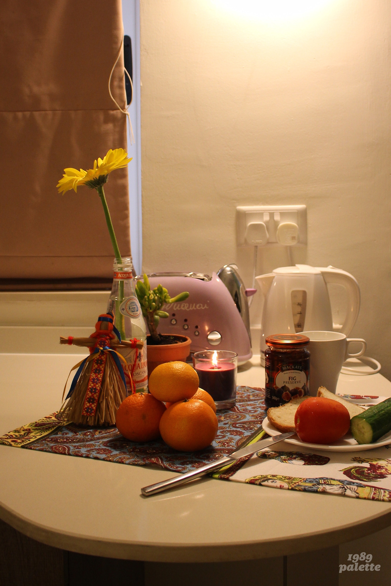 방에 오자마자, 몰타로 오는 길에 여행했던 러시아에서 산 테이블보를 탁자에 깔았다. 우주목 화분이 놓일 자리였다. 그 옆엔 다 쓴 생수병에 물을 채워 거베라를 꽂아 두었다. 거베라 줄기 끝을 살짝 자르는 것도 잊지 않았다. 마트에서 사 온 백합향 초에 불을 켰다. 노란 조명이 비추는 방에 어울리는 분위기가 완성되었다. 어느 곳이든 머무는 곳을 집(Home) 답게. 이건 내게 포기할 수 없는 영역 중 하나다. 호텔, 숙소, 기숙사라는 말보다 집이라는 이름으로 이 공간을 부를 수 있도록 모양새가 갖춰졌다.