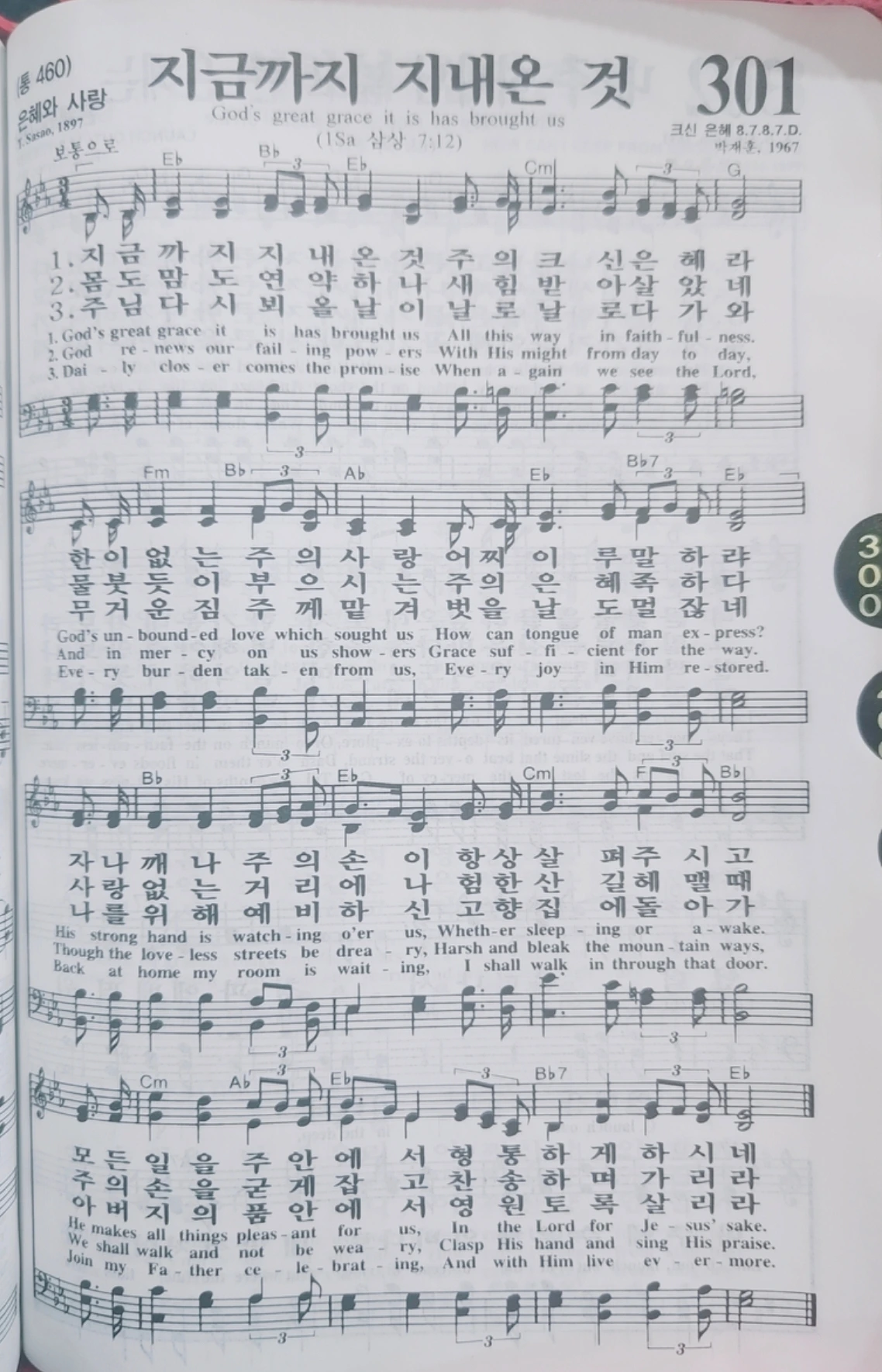 찬송가의 제목이 영어로는 'God's great grace it is has brought us'가 어떻게 '지금까지 지내온 것'이라고 한글로 번역이 되었을까. 흥미로웠다.