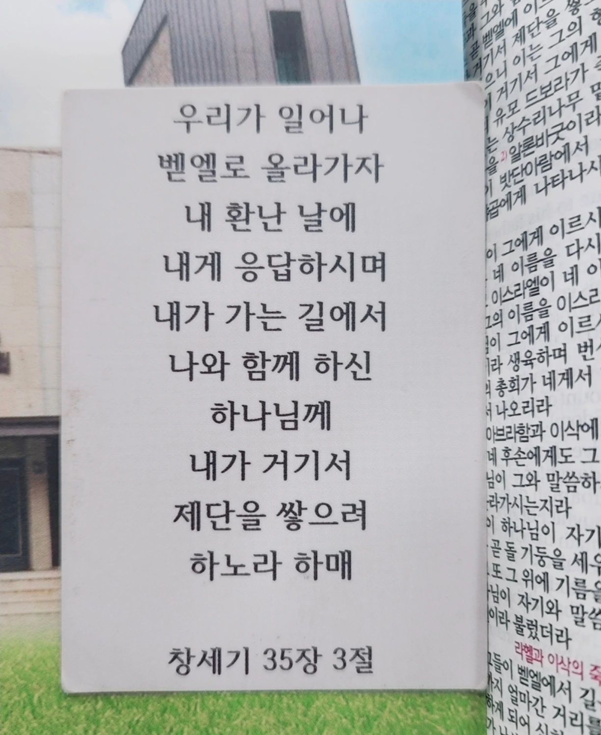 그날 목사님 설교의 성경말씀은 '창세기 35:1~8'이었으며 말씀 제목은 '우리가 일어나 벧엘로 올라가자'였다. '벧엘에 올라가자'를 제목을 본 순간 나는 나의 외투 주머니 안에 있던 카드지갑을 꺼냈다. 그 안에는 예전에 내가 뽑았던 말씀 카드가 있었다.