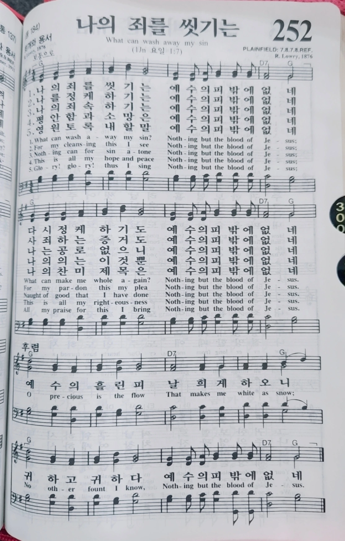 위 제목은 2026년 1월 18일 예배시간에 부른 찬송가 252장의 제목이다. '나의 죄를 씻기는(What can wash away my sin)' 찬송가에서 좋았던 구절은 아래 후렴구이다.