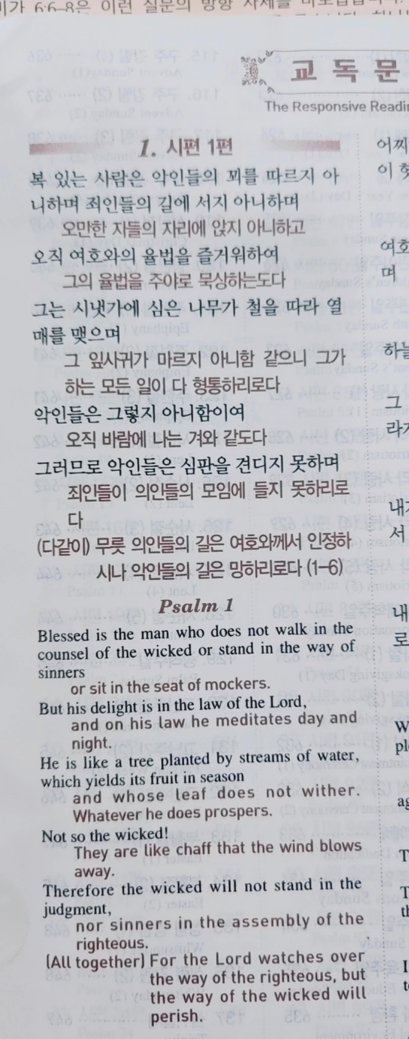 그날은 교독문(1. 시편 1편)을 읽는데 마음에 와닿은 구절이 있었다. 그 구절은 '그의 율법을 주야로 묵상하는 도다.(on his law he meditates day and night.)'이다.