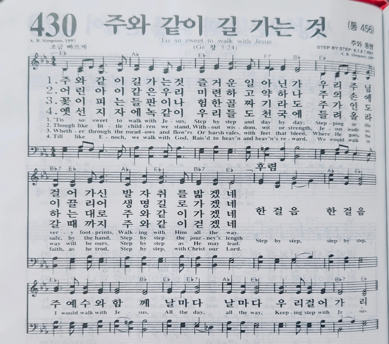 위 제목은 2월 8일 주일날 목사님의 설교를 듣고 나서 부른 찬송가 430장의 제목이다. '주와 같이 길 가는 것(Tis So Sweet to Walk with Jesus)'이 찬송가는 1절부터 4절까지 후렴구를 포함한 모든 가사가 마음에 와닿았다.