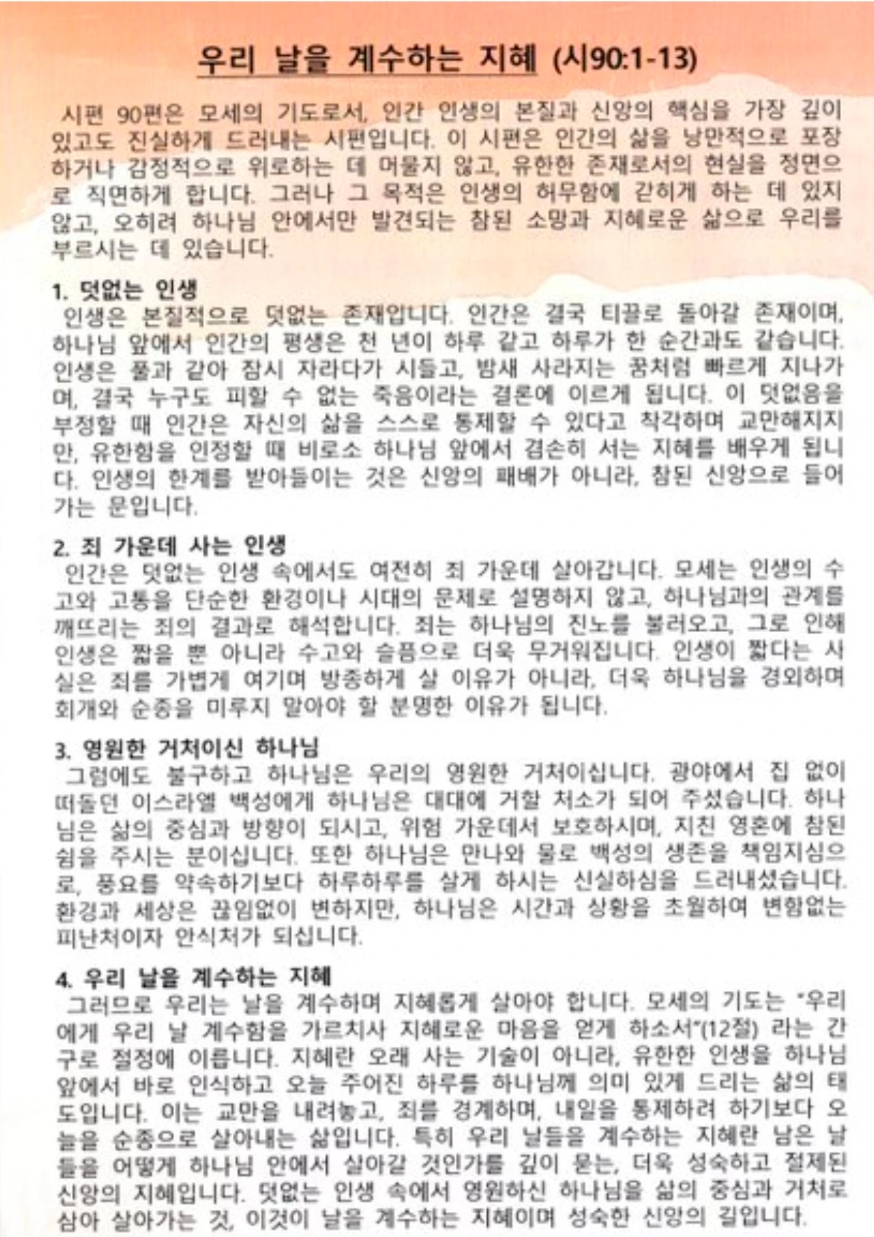 4. 정리하면 ‘우리 날을 계수하는 지혜’란 내 삶의 날들이 제한되어 있음을 알고, 매 순간을 하나님 뜻 안에서 의미 있게 살아가는 지혜이다.