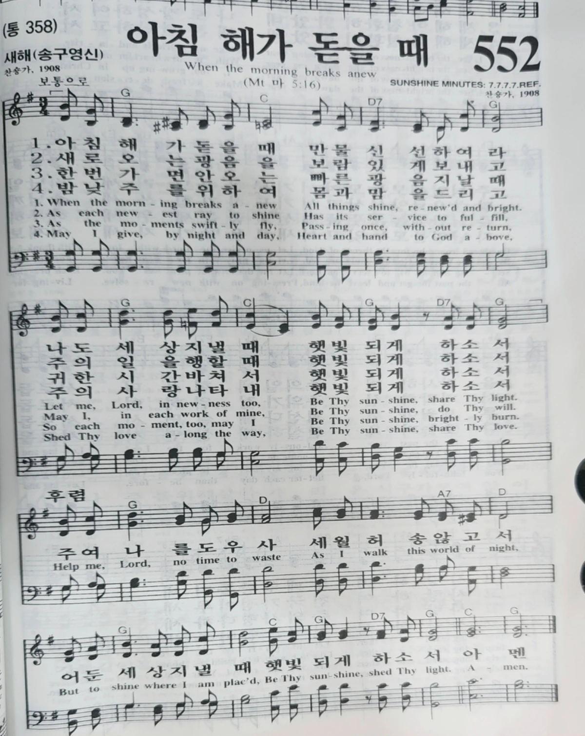 언제나처럼 나는 한글과 비교하며 영어 가사를 읽었다. 후렴구 전체가 나에게 은혜가 되었지만 그중에서도 '세월 허송 않고서(no time to wast)' 가사가 마음에 와닿았다. 찬송가를 부르는 중에 나는 '나의 시간을 낭비하고 있지는 않은가?', '주님이 주신 이 소중한 나의 삶, 나의 시간들을 그냥 허송세월 흘려보내고 있지는 않은가?'라는 질문들이 생각나면서 스스로에게 묻고 있었다. '낭비하는 삶을 살지 않겠노라. 나의 소중한 시간들을 그냥 허송세월 흘려보내지 않겠노라.' 다짐하였다. 그리고 스마트폰으로 찬송가 552장을 찍어두었다. 그 순간의 나의 마음, 그 다짐을 간직하고 싶었다. '연재 브런치북'을 만들게 된 계기가 이때(2025년 12월 14일)부터였던 거 같다.