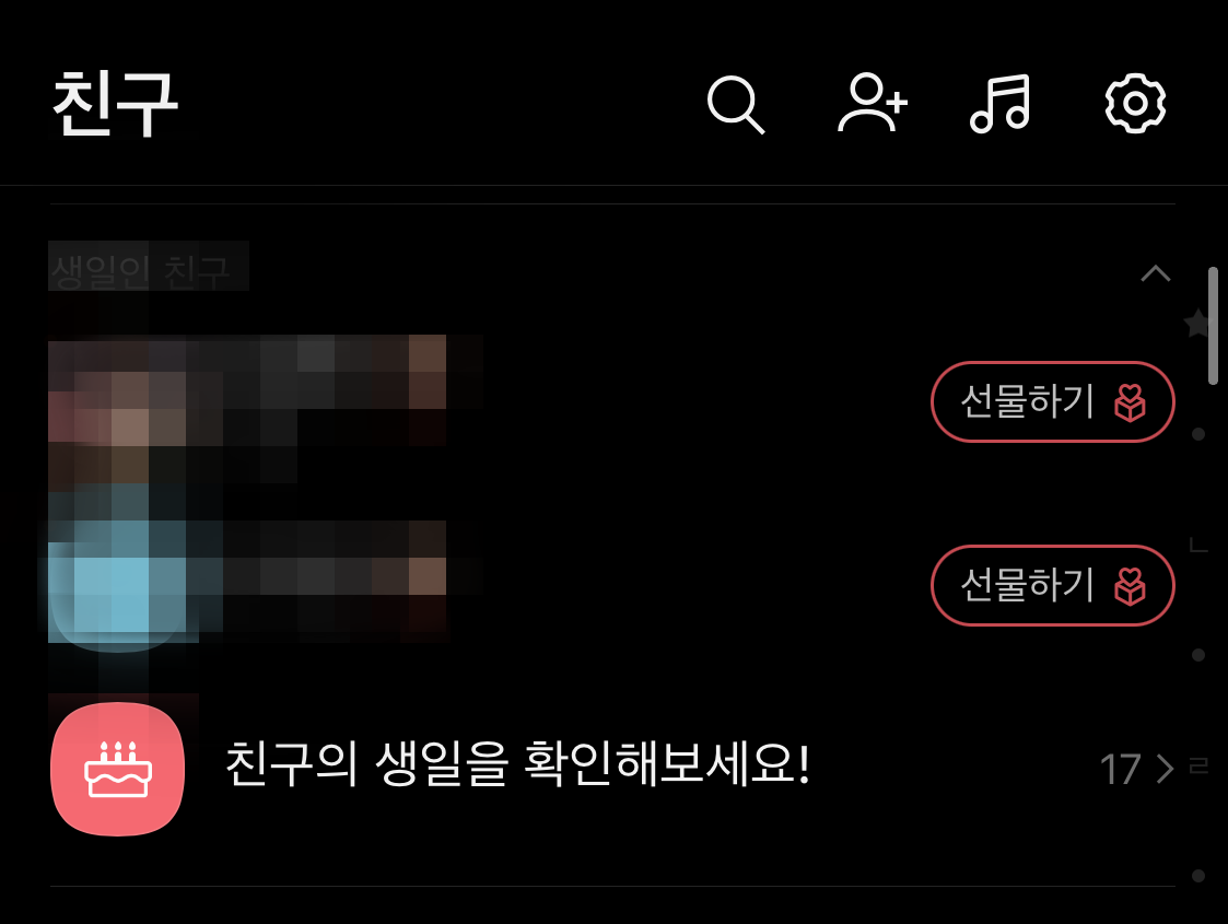 하여, 나의 옹졸한 의심이 가리키는 방향은 한 군데였다. 언제 연락했는지도 모르는 친구들이 재고처럼 쌓여 있는 창 상단, 나의 감정을 드러내기도 하고 숨기기도 하는 창구인 '내 프로필' 밑에 자리를 잡은 '생일인 친구'에 내가 나타났겠거니 한 것이다. 지인들에게 내 생일을 상기시켜준 대가로 카카오는 꼬리표를 붙여놓는다. '선물하기' 버튼을 말하는 것이다.