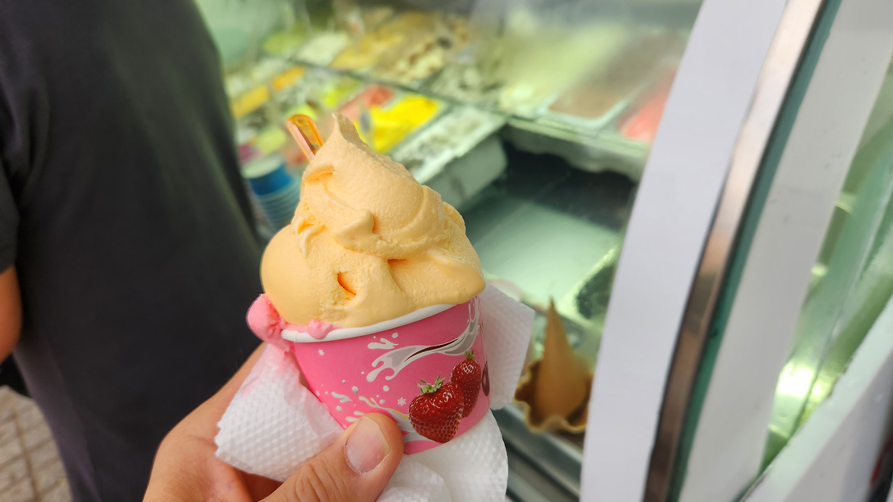 아이스크림 집에 일하는 젊은이가 미소를 가득 머금고 참 행복하게 일을 한다. 샘플로 아이스크림 하나를 떠 준다. 안 사 먹을 수 없는 친절과 서비스... 어린아이 입맛 소유자인 내가 좋아하는 딸기와 복숭아맛 아이스크림 한 컵을 들고 호텔로 향한다.