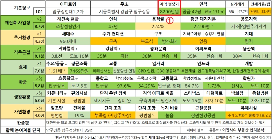 지역 평당가는 아파트 입지분석에서 가장 중요한 요소 중 하나입니다. 다른 모든 조건이 열세임에도 불구하고 좋은 입지의 아파트가 그렇지 못한 입지의 아파트 가격을 훌쩍 뛰어넘는 경우를 흔히 볼 수 있는데요. 이는 아파트가 위치한 지역이 단순한 주거환경을 넘어 하나의 지역 브랜드를 형성하고 있기 때문입니다. 명품이 그 브랜드만으로 가격이 수 배에서 수십 배로 책정될 수 있는 것처럼, 대한민국에서 좋은 입지의 아파트는 이미 필수재를 넘어 사치재의 영역에 접어든지 오래입니다. 따라서 많은 사람들이 열악한 주거환경을 감수하고서라도 상급지에 위치한 아파트를 매수하고자 하는데요. 추후 재건축이나 인근 개발을 통해 주거환경이 개선되면 아파트 가격이 지역 평당가에 수렴하면서 크게 올라갈 것이라고 기대하는 것입니다. 하지만 주거환경이 열악한 만큼 이것이 개선되기 전까지는 아무래도 몸이 좀 고생하겠죠? 그래서 이러한 투자 방식을 몸테크라고 합니다.