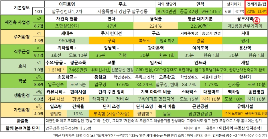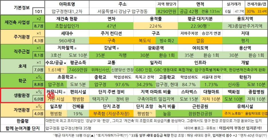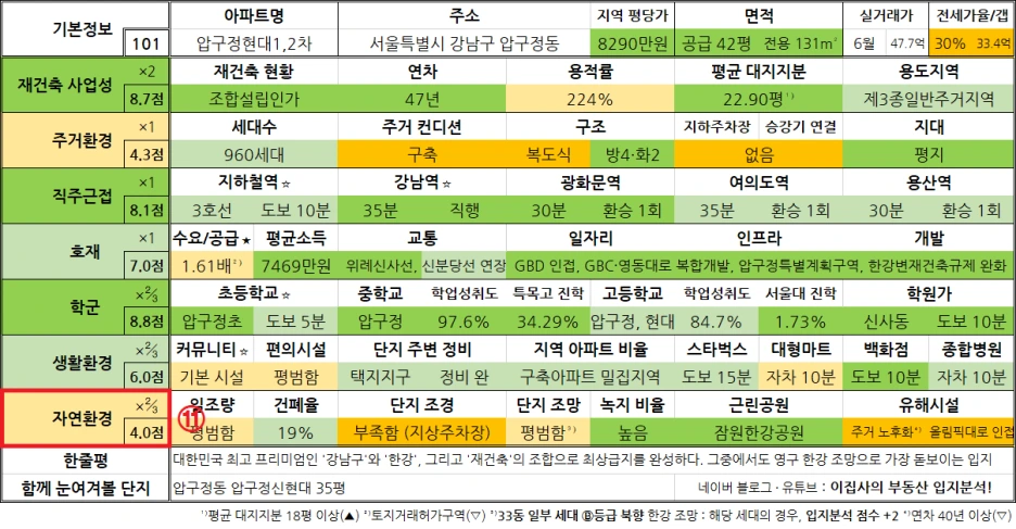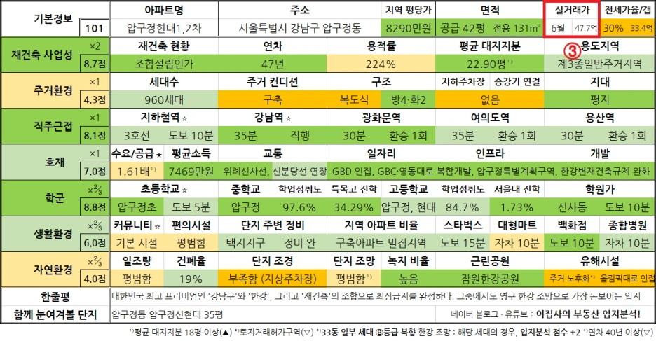 위 입지분석 TOOL을 유심히 보신 분이라면 아파트 입지분석에 총 열한 가지 요소가 있음을 확인하실 수 있었을 겁니다. ① 지역 평당가, ② 면적, ③ 실거래가, ④ 전세가율, ⑤ 주거가치(재건축 사업성) ⑥ 주거환경, ⑦ 직주근접, ⑧ 호재, ⑨ 학군, ⑩ 생활환경, ⑪ 자연환경이 그것인데요. 입지분석 TOOL은 특정 아파트에 대한 입지분석의 열한 가지 요소를 입력하면 ⑫ 종합 점수가 자동적으로 산정되도록 설계되어 있습니다. 이를 통해 여러분이 가용 자금 내에서 최적의 아파트를 선택할 수 있도록 돕는 것이 TOOL 개발의 궁극적인 목적이라고 할 수 있죠. 그렇다면 좋은 아파트를 고르기 위해 왜 입지분석의 열한 가지 요소를 모두 고려해야 할까요? 지금부터 그 이유를 자세히 설명드리도록 하겠습니다.