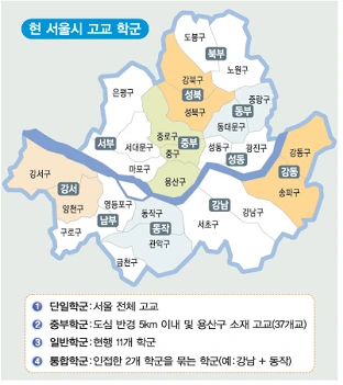 ⓒ 고등학군 : 고등학교 배정의 경우 초등학교, 중학교보다 선택의 폭이 넓어지는데요. 서울의 경우 평준화 단일학교군으로서 1단계에서 서울시 전체 고등학교 중 2개교에 지원할 수 있습니다(추첨을 통해 학교 정원의 20% 선발). 이론적으로는 강남에 거주하지 않는 학생도 강남 학군의 고등학교에 진학할 가능성이 있는 것이지요. 그러나 이 역시 이론일 뿐이고, 2단계에서는 거주지가 속한 일반학교군 고등학교 중 2개교에 지원해야 하며(추첨을 통해 학교 정원의 40% 선발), 학교 정원의 나머지 40%는 통합학교군(일반학교군 + 인접한 일반학교군) 내에서 중학교와 마찬가지로 통학여건을 고려한 추첨 방식을 통해 선발하기 때문에 학생들은 대부분 거주지가 속한 일반학교군 내 고등학교에 진학하게 됩니다.