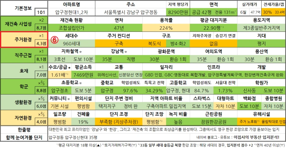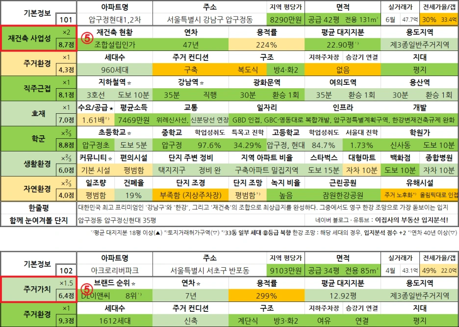 주거가치는 구축 아파트의 경우 ⓐ 재건축 현황, ⓑ 연차, ⓒ 용적률, ⓓ 평균 대지지분, ⓔ 용도지역의 세부 요소로 다시 나뉩니다. 재건축 이슈가 없는 신축 아파트의 경우에는 ⓐ 재건축 현황 대신 ⓕ 브랜드 순위로 이를 판단합니다.
