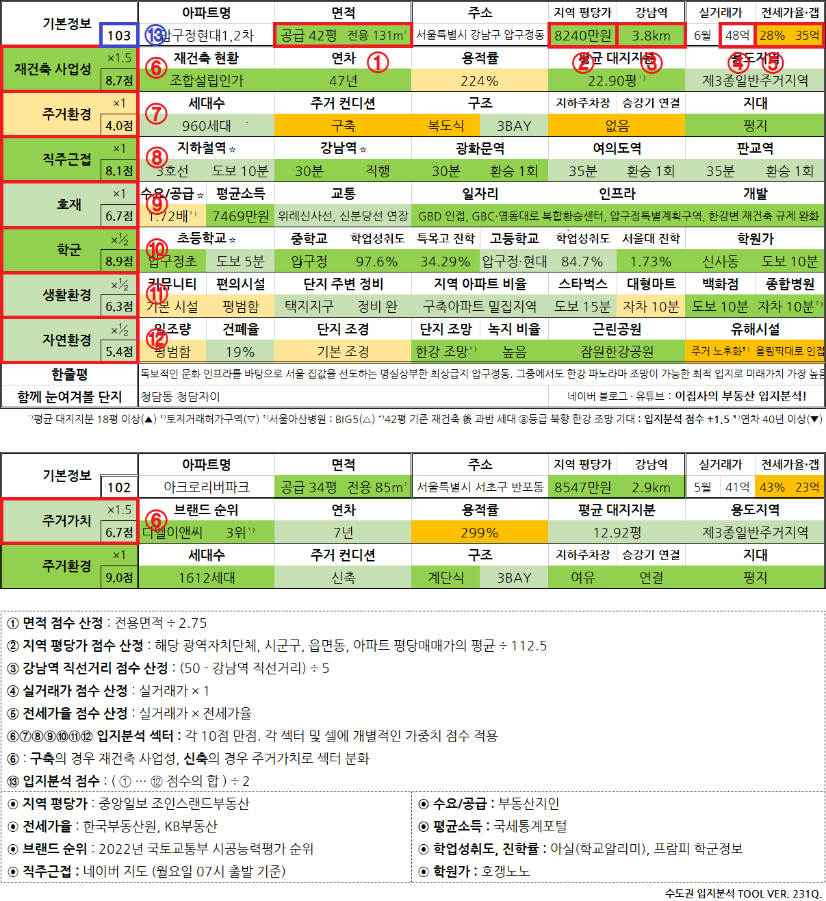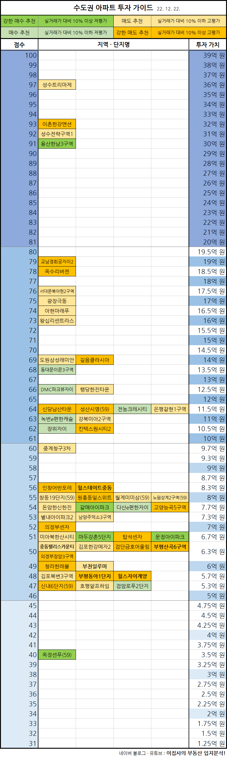 - 현재까지 누적된 입지분석 데이터를 바탕으로 각 수도권 아파트별 투자 가치를 산정했습니다.