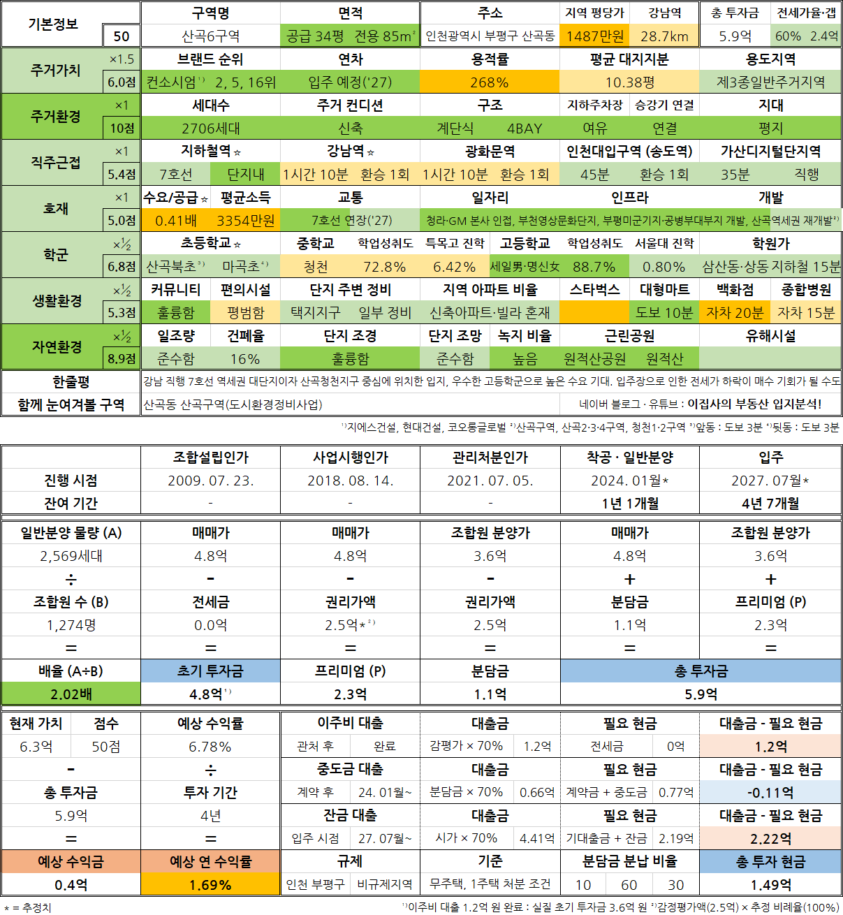 - 강남 직행 7호선 역세권 대단지이자 산곡청천지구 중심에 위치한 입지, 우수한 고등학군으로 높은 수요 기대. 입주장으로 인한 전세가 하락이 매수 기회가 될 수도