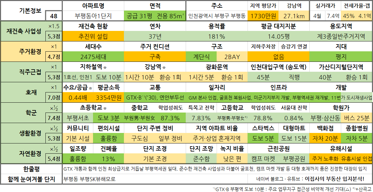 - GTX 개통과 함께 인천 최상급지로 거듭날 부평역세권 일대. 준수한 재건축 사업성과 더불어 굴포천, 캠프 마켓 개발 등 대형 호재까지 품은 진정한 대장의 입지