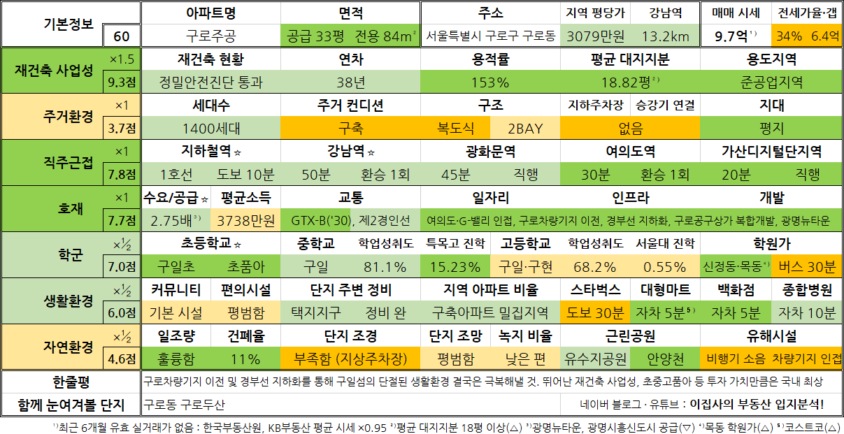 - 구로차량기지 이전 및 경부선 지하화를 통해 구일섬의 단절된 생활환경 결국은 극복해낼 것. 뛰어난 재건축 사업성, 초중고품아 등 투자 가치만큼은 국내 최상