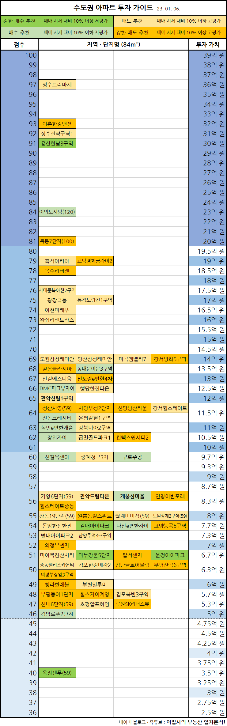 - 현재까지 누적된 입지분석 데이터를 바탕으로 각 수도권 아파트별 투자 가치를 산정했습니다.