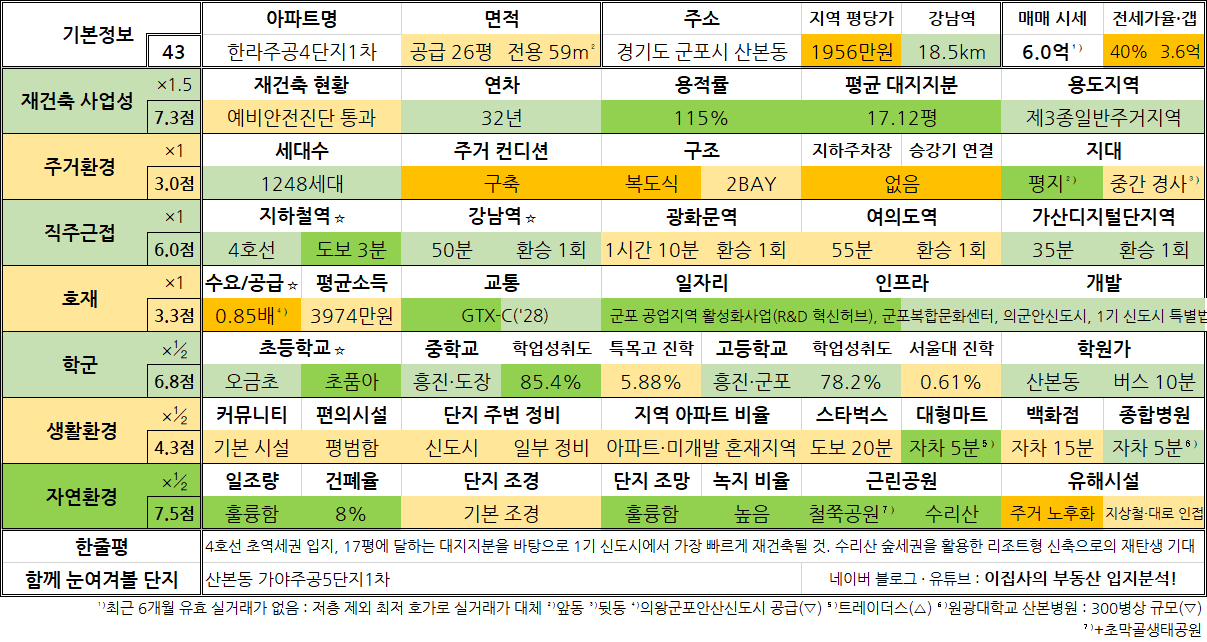 - 4호선 초역세권 입지, 17평에 달하는 대지지분을 바탕으로 1기 신도시에서 가장 빠르게 재건축될 것. 수리산 숲세권을 활용한 리조트형 신축으로의 재탄생 기대