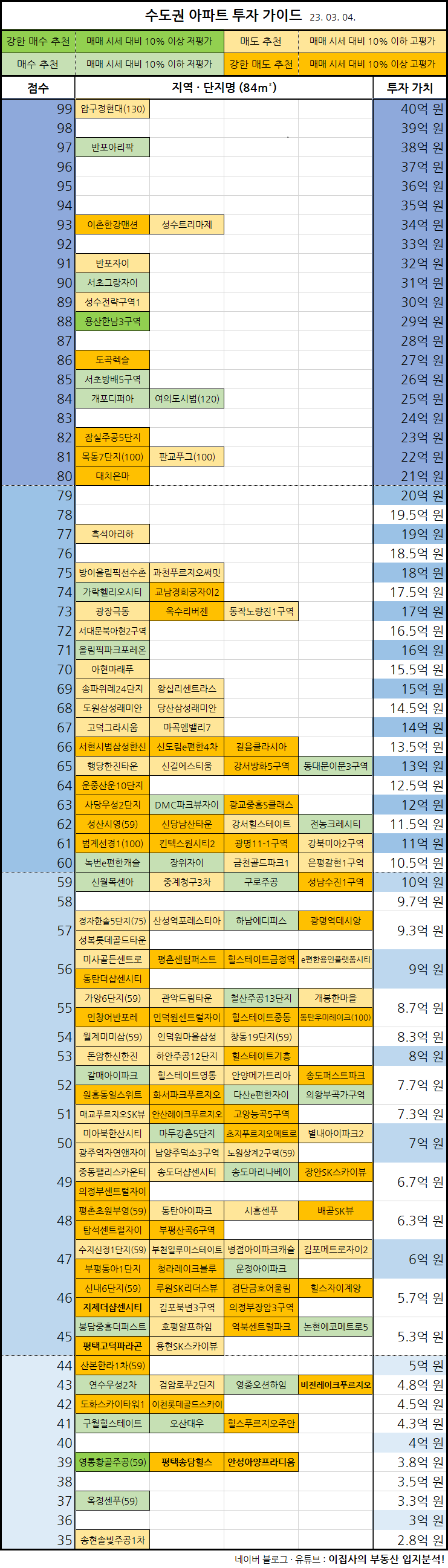 - 매수 추천은 해당 아파트의 매매 시세와 투자 가치 (입지분석 점수) 간 차이를 기반으로 이루어지며, 매 분기 업데이트 됩니다.