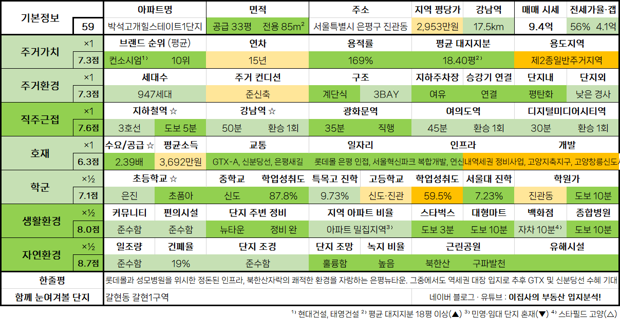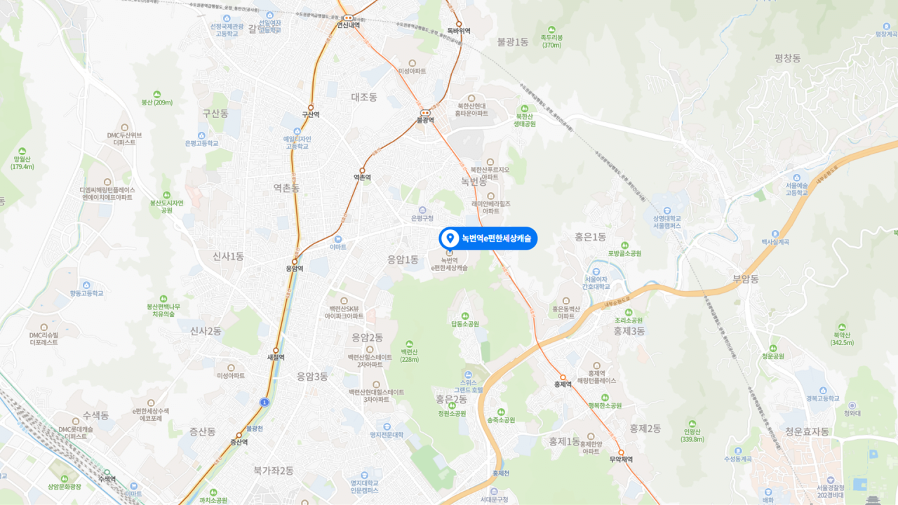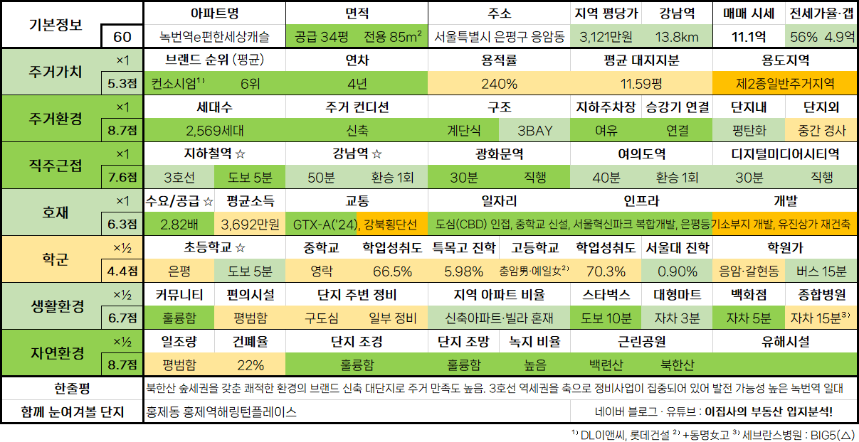 - 북한산 숲세권을 갖춘 쾌적한 환경의 브랜드 신축 대단지로 주거 만족도 높음. 3호선 역세권을 축으로 정비사업이 집중되어 있어 발전 가능성 높은 녹번역 일대