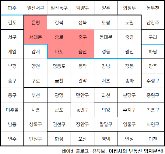 - 서울 서북부 행정구역 : 용산구, 마포구, 종로구, 중구, 서대문구, 은평구