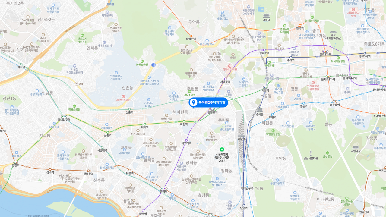 - 인근 정비구역과의 시너지를 통해 도심 한가운데 위치한 미니 신도시로 재탄생할 북아현뉴타운. 서울역, 용산 개발의 직접 수혜를 받는 핵심 입지로 미래가치 최상