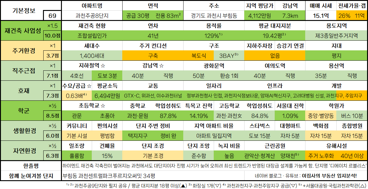 - 하이엔드 재건축 각축전이 벌어지는 과천에서도 대단지이자 진행 시기가 늦어 오히려 최신 트렌드가 반영된 대장급 설계를 가능케 함. 단지명 '디에이치 르블리스'