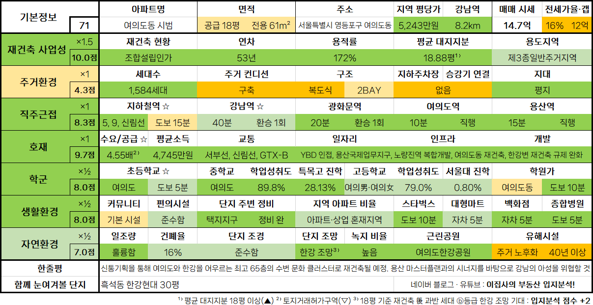- 신통기획을 통해 여의도와 한강을 어우르는 최고 65층의 수변 문화 클러스터로 재건축될 예정. 용산 마스터플랜과의 시너지를 바탕으로 강남의 아성을 위협할 것