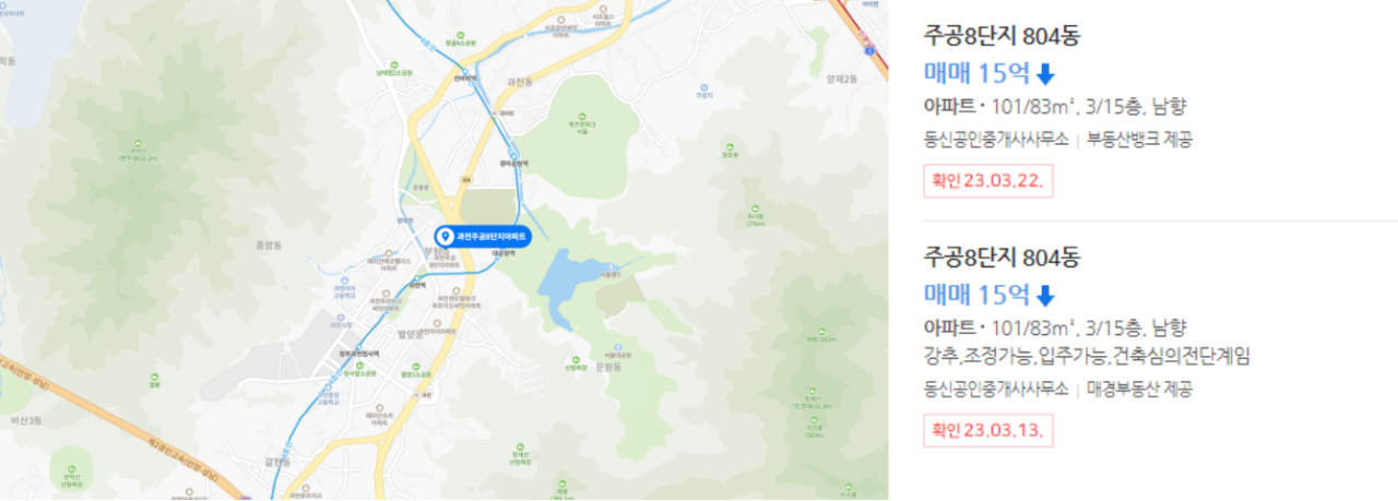 - 네이버 부동산 기준 15억 2천만 원 이하의 입주 가능한 매물이 있는 단지