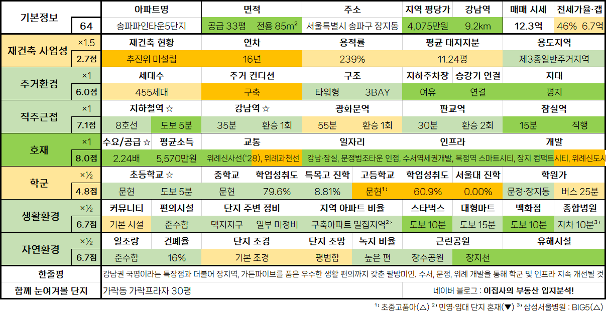 - 강남권 국평이라는 특장점과 더불어 장지역, 가든파이브를 품은 우수한 생활 편의까지 갖춘 팔방미인. 수서, 문정, 위례 개발을 통해 학군 및 인프라 지속 개선될 것