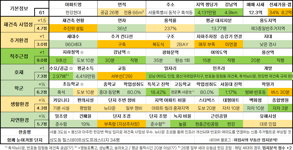 - 서울 3도심 + 용산과 마주한 한강변 핵심 입지로 재건축 사업성 우수. 뉴타운 조성을 통해 인프라 개선되며 반포와 여의도를 연결하는 신흥 주거벨트로 부상할 것