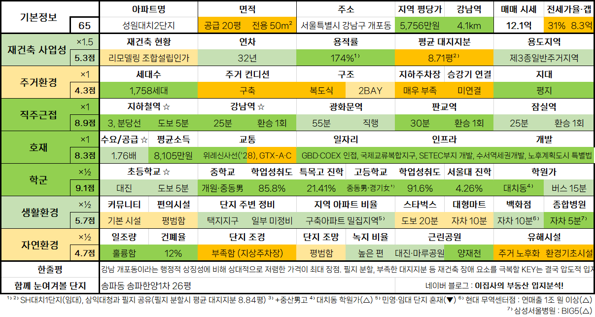 - 강남 개포동이라는 행정적 상징성에 비해 상대적으로 저렴한 가격이 최대 장점. 필지 분할, 부족한 대지지분 등 재건축 장애 요소를 극복할 KEY는 결국 압도적 입지