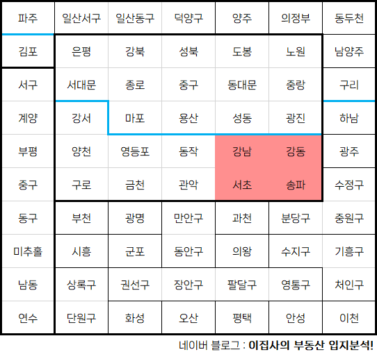 - 서울 동남부 행정구역 : 강남구, 서초구, 송파구, 강동구