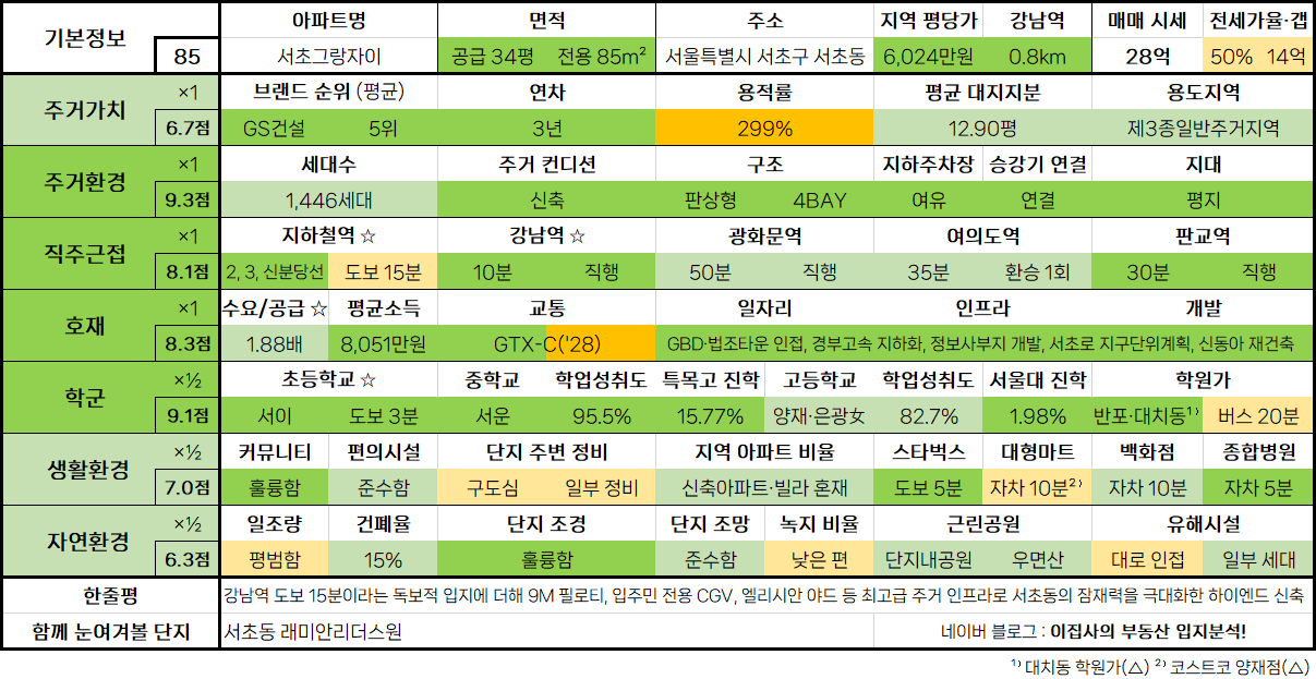 - 강남역 도보 15분이라는 독보적 입지에 더해 9M 필로티, 입주민 전용 CGV, 엘리시안 야드 등 최고급 주거 인프라로 서초동의 잠재력을 극대화한 하이엔드 신축