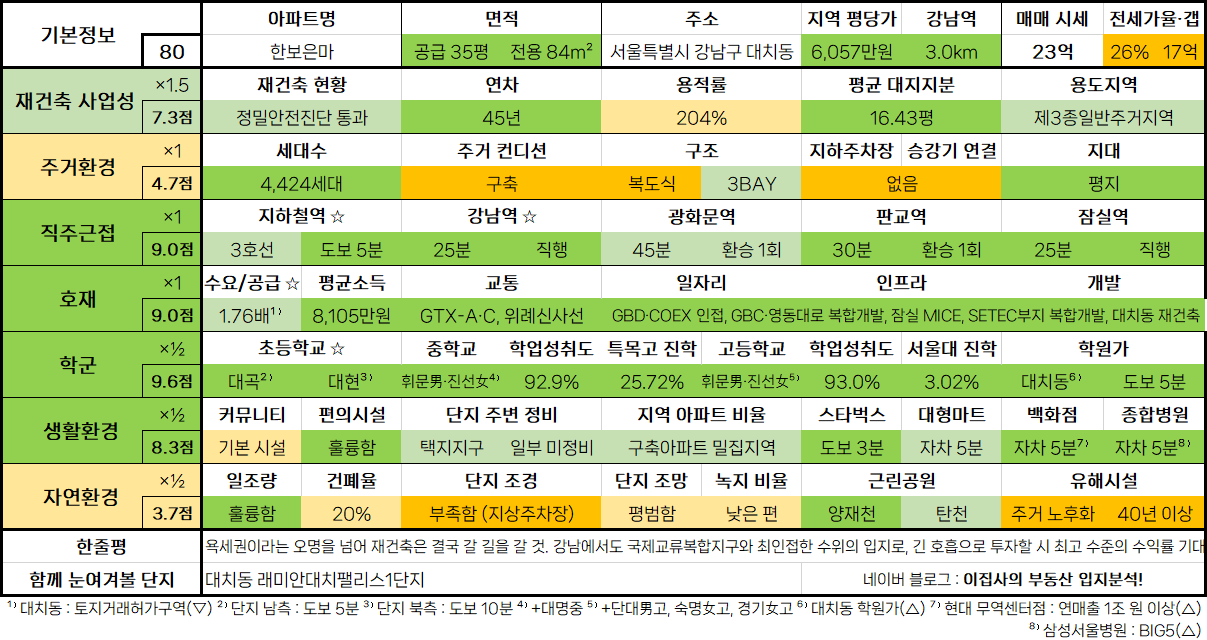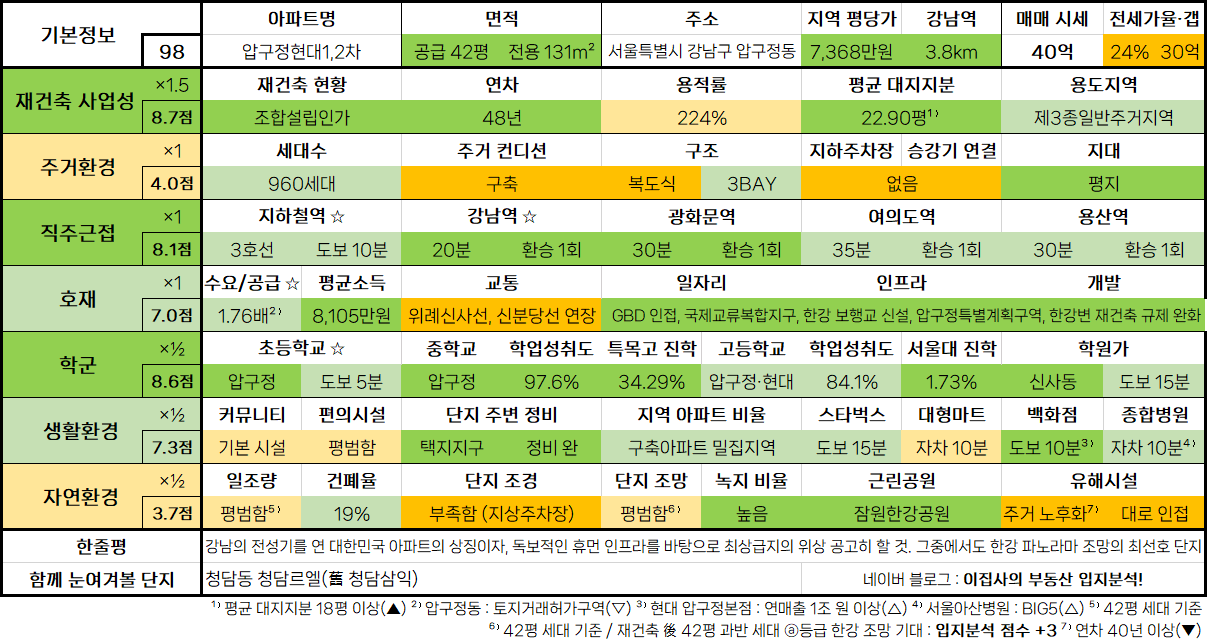- 강남 8학군 중심부에 위치한 1세대 재건축 아파트의 상징이자, 최적의 주거 인프라 및 교육 환경을 갖춘 명품 단지. 테헤란로 지가 상승 헷지를 위한 최적 투자처