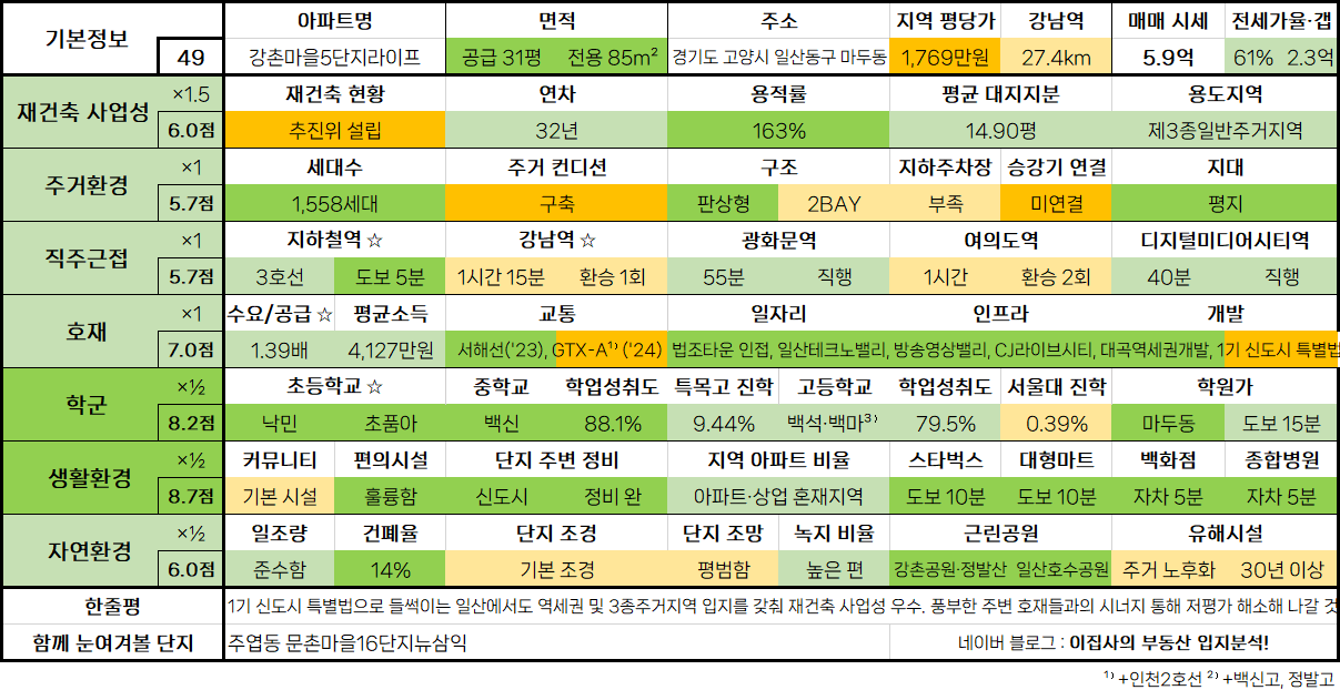 - 1기 신도시 특별법으로 들썩이는 일산에서도 역세권 및 3종주거지역 입지를 갖춰 재건축 사업성 우수. 풍부한 주변 호재들과의 시너지 통해 저평가 해소해 나갈 것