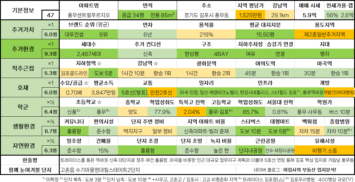 - 트레이더스를 품은 역세권 신축 대단지로 정주 여건 훌륭함. 마곡을 비롯한 인근 대규모 업무지구 계획과 더불어 5호선 연장 통해 김포 핵심 입지로 거듭날 풍무동