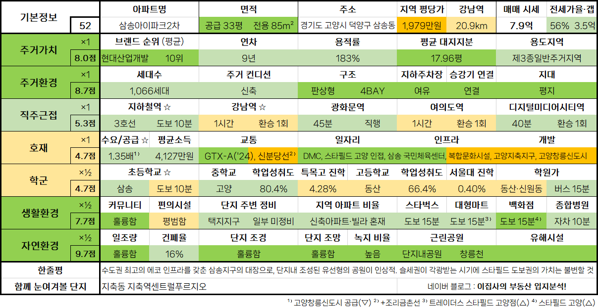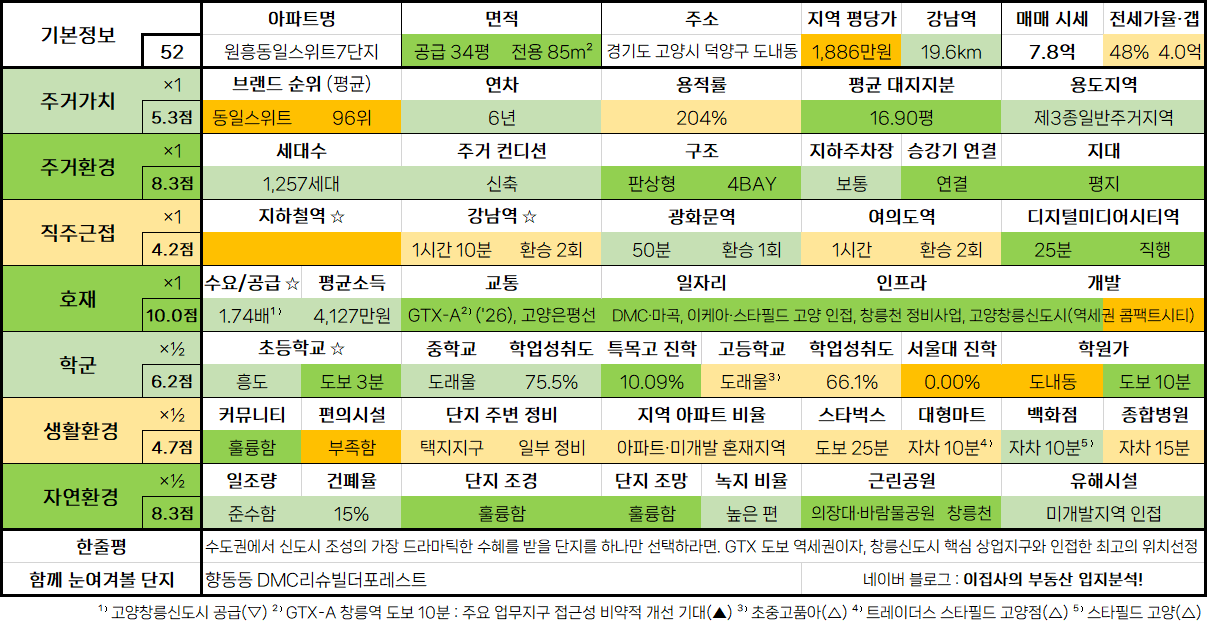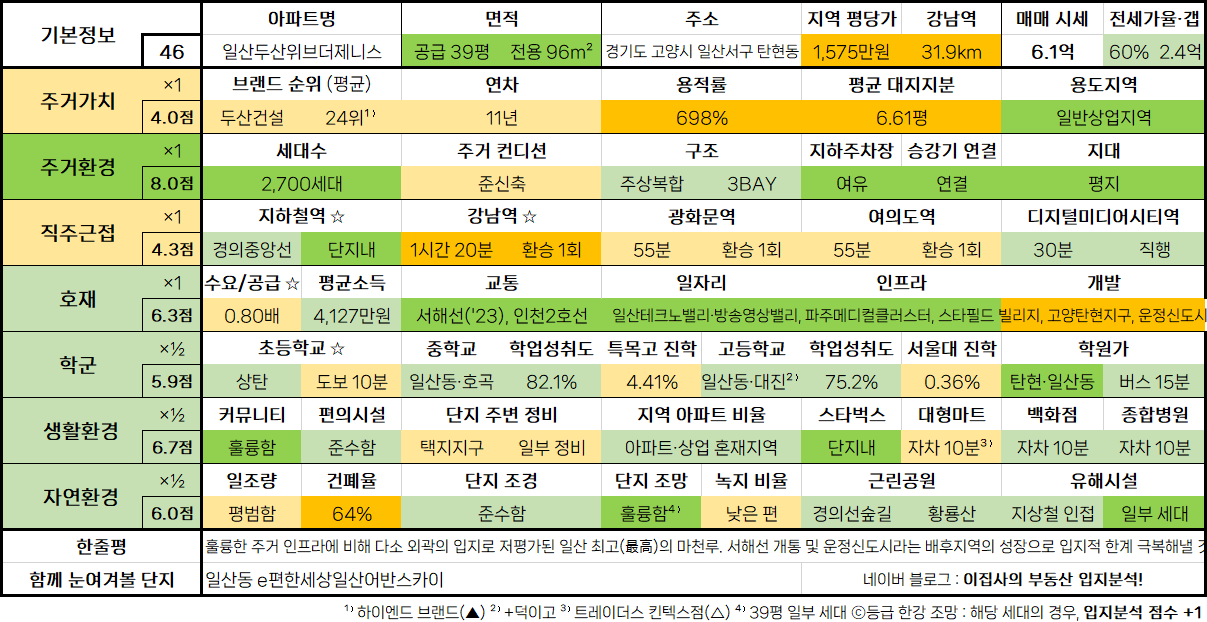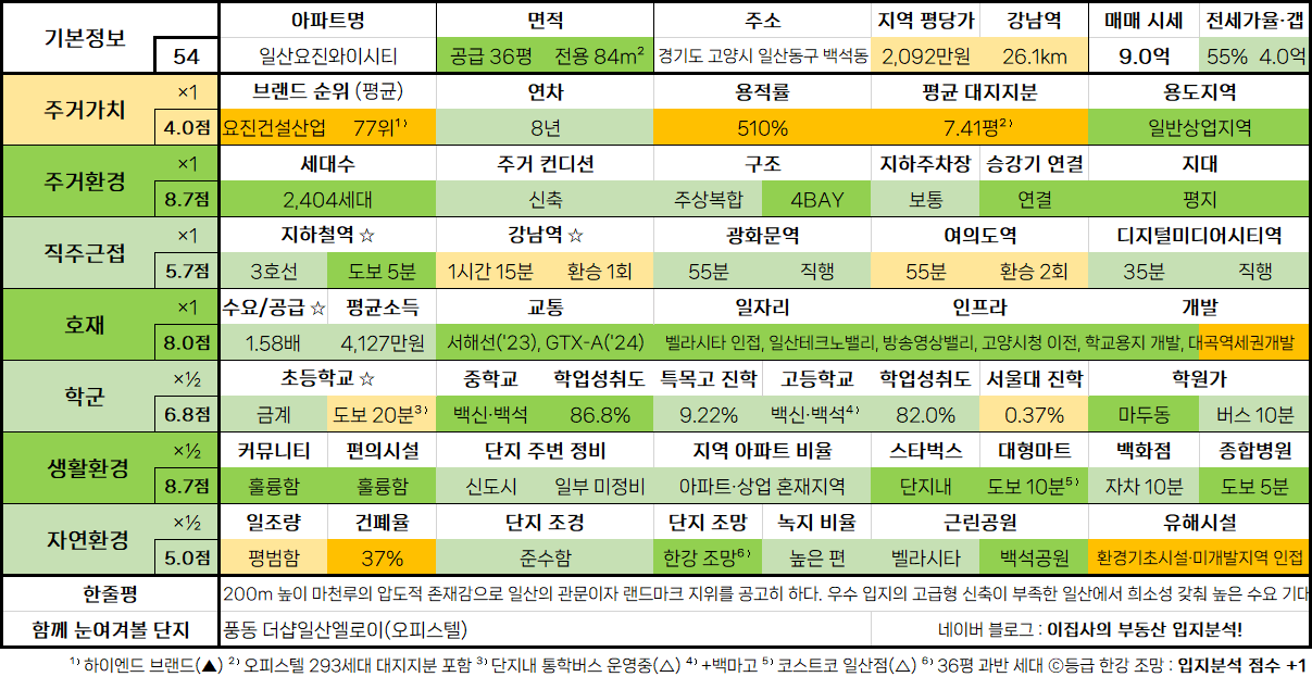- 훌륭한 주거 인프라에 비해 다소 외곽의 입지로 저평가된 일산 최고(最高)의 마천루. 서해선 개통 및 운정신도시라는 배후지역의 성장으로 입지적 한계 극복해낼 것