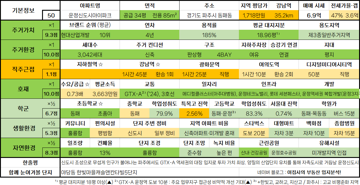 - 신도시 조성으로 무섭게 인구가 불어나는 파주에서도 GTX-A 역세권의 대장 입지로 투자 가치 최상. 양질의 산업단지 유치를 통해 자족도시로 거듭날 운정신도시