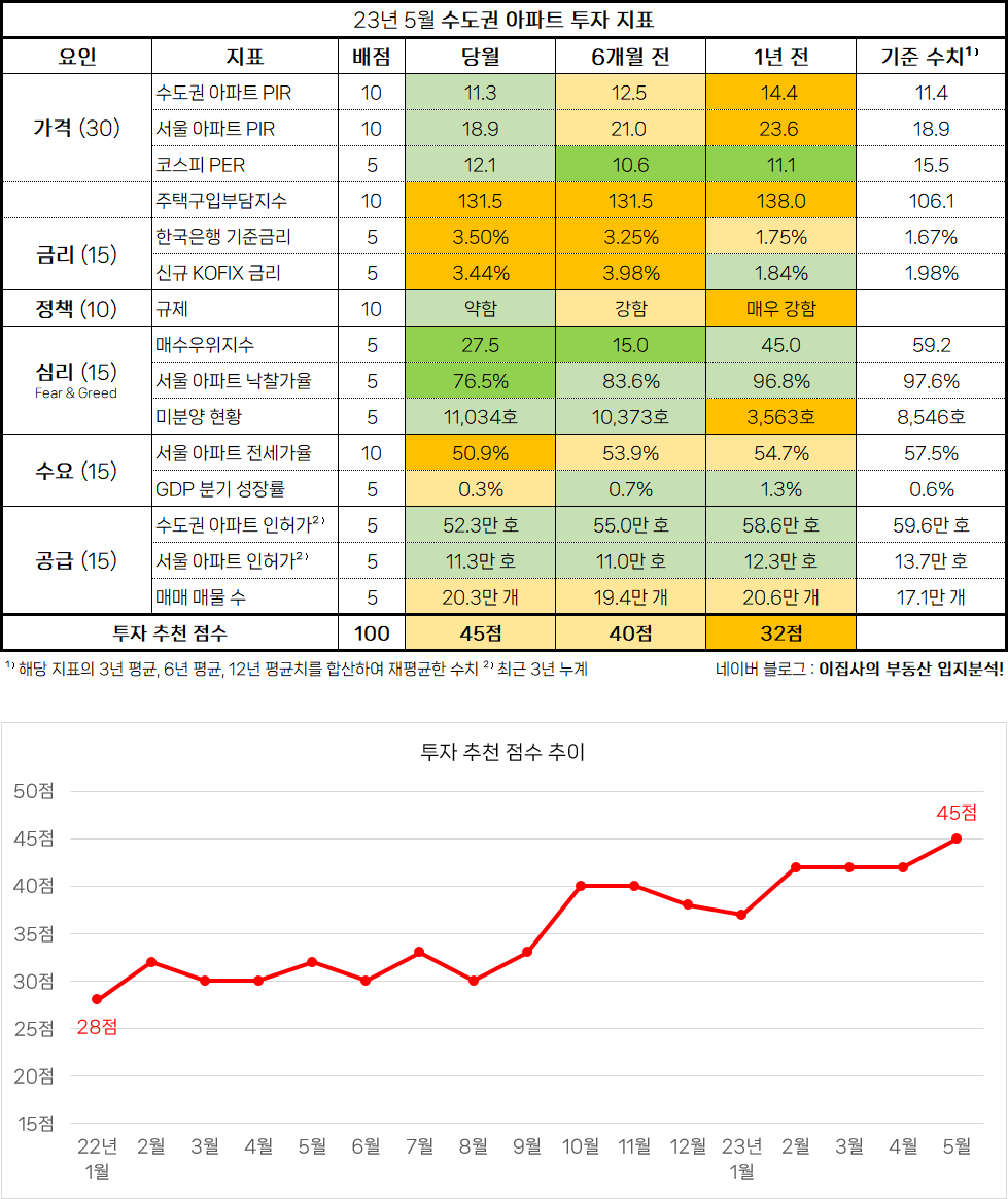 - 짙은 초록색일수록 투자 우호적, 짙은 노란색일수록 투자 비우호적 지표입니다.