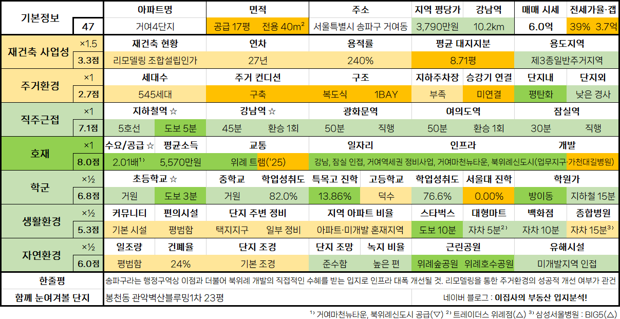 - 송파구라는 행정구역상 이점과 더불어 북위례 개발의 직접적인 수혜를 받는 입지로 인프라 대폭 개선될 것. 리모델링을 통한 주거환경의 성공적 개선 여부가 관건