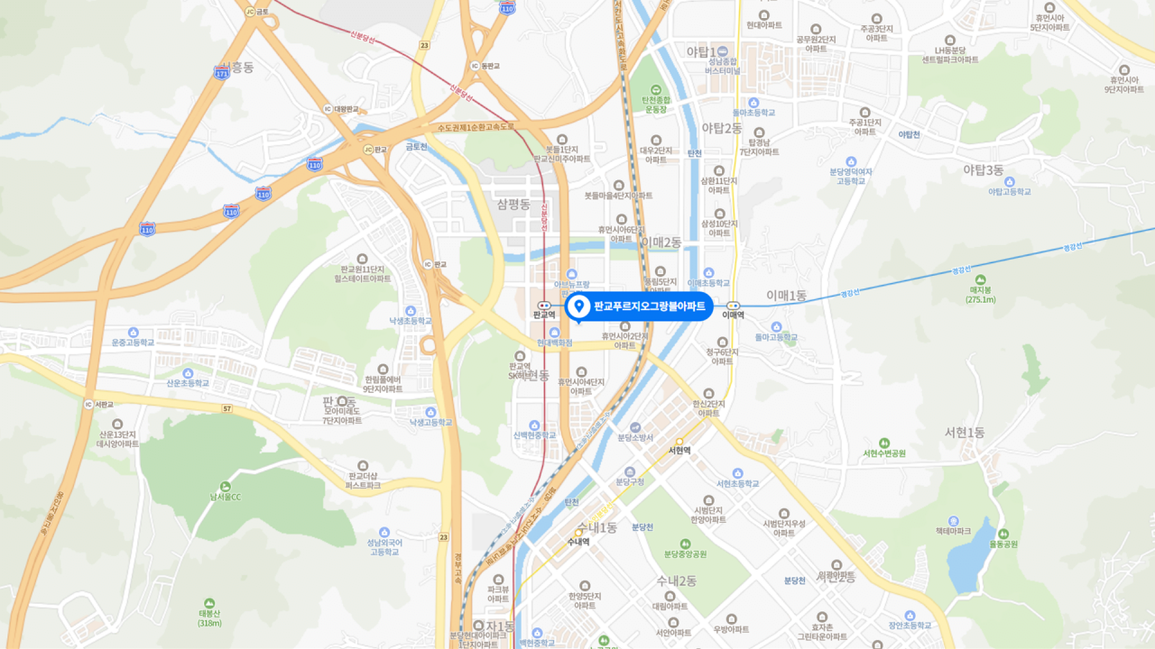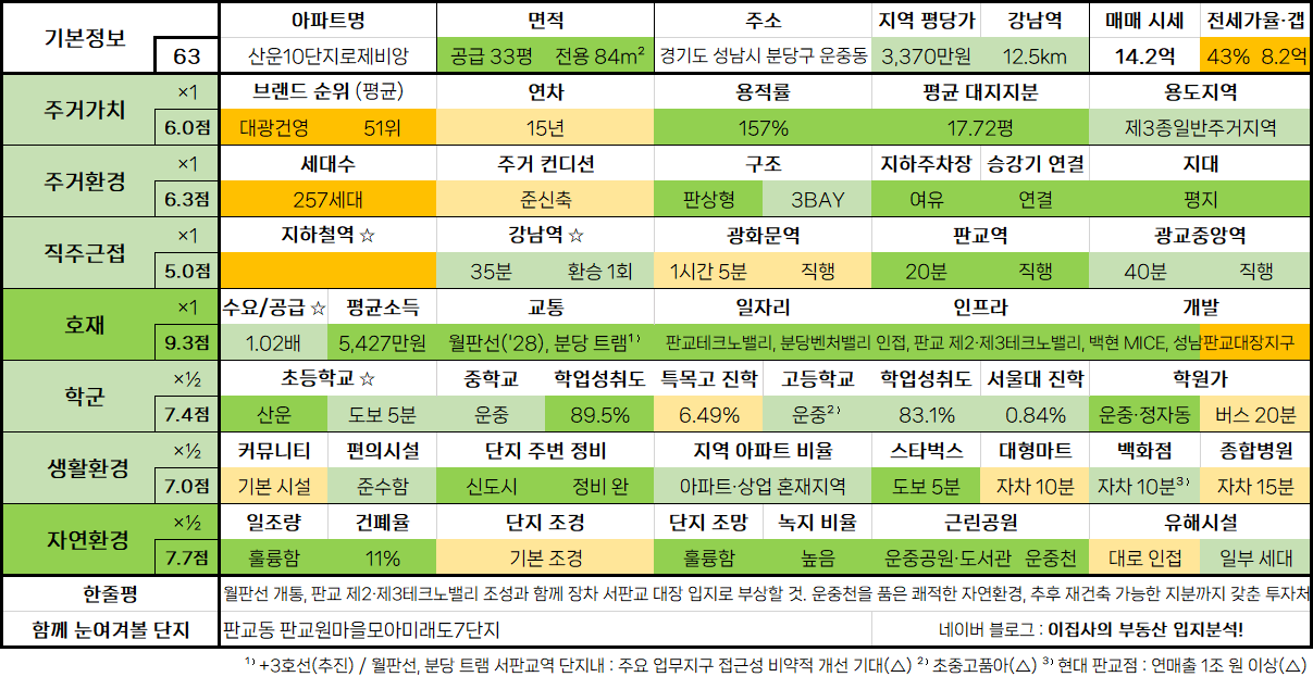 - 월판선 개통, 판교 제2·제3테크노밸리 조성과 함께 장차 서판교 대장 입지로 부상할 것. 운중천을 품은 쾌적한 자연환경, 추후 재건축 가능한 지분까지 갖춘 투자처