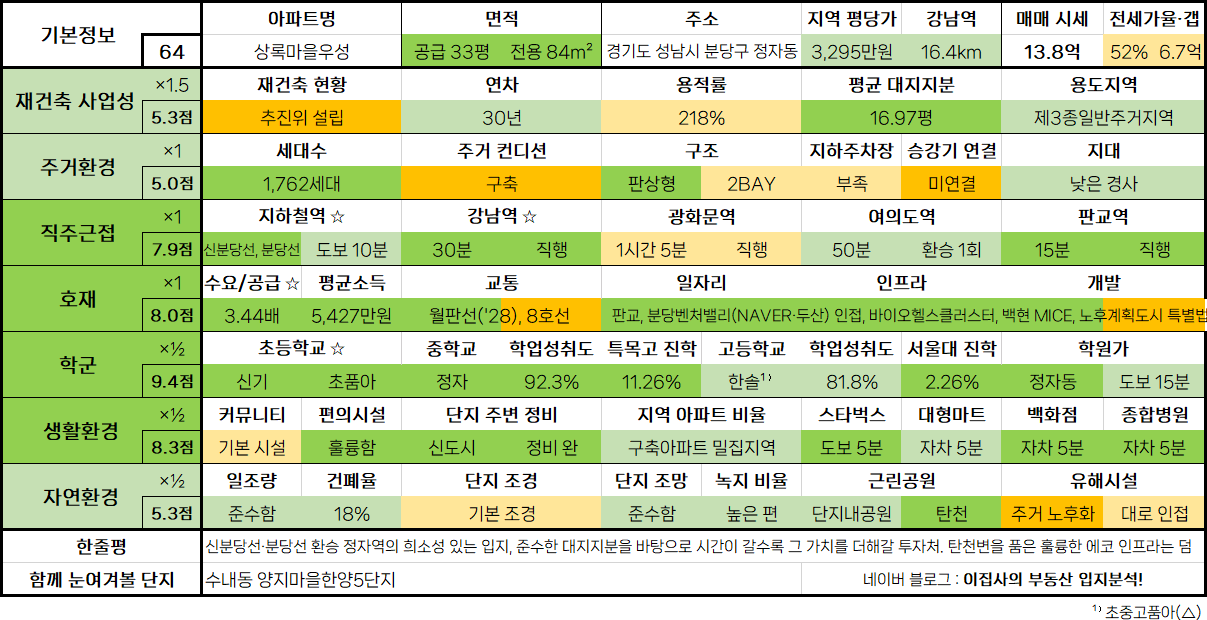 - 일부 PC공법으로 준공되었으며, 준수한 대지지분 및 소득 수준을 갖춰 재건축 사업성 양호. 특별법에 기반한 완화적 지구단위계획 수립으로 가치 추가 상승할 것
