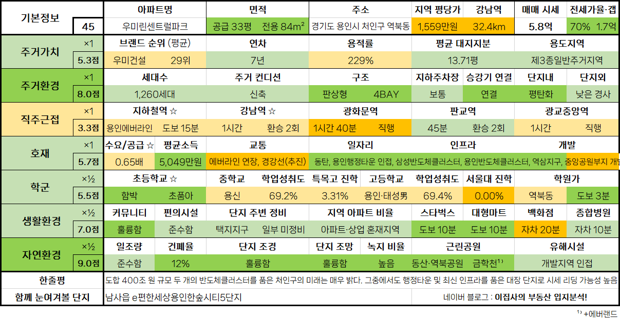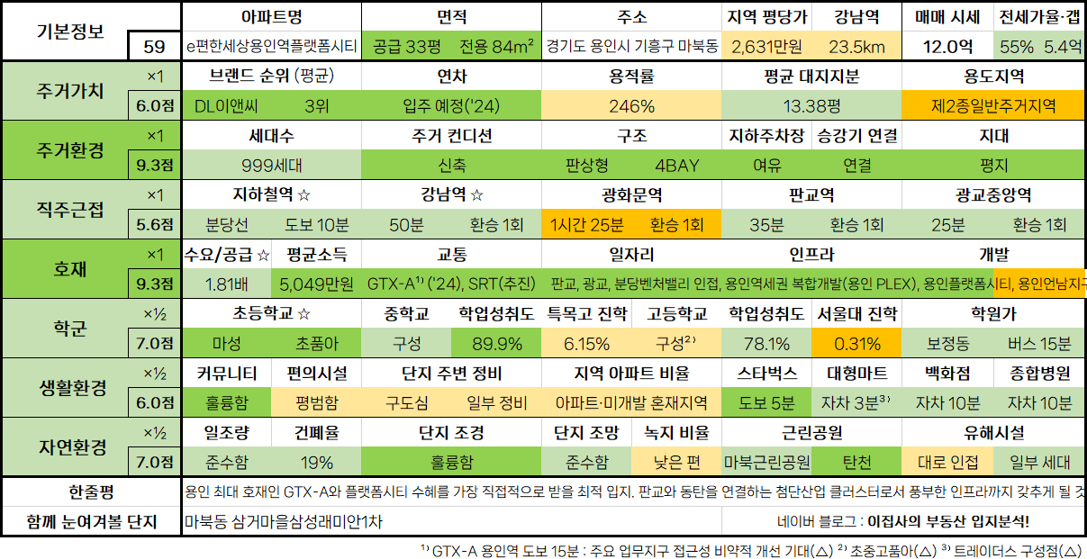 - 도합 400조 원 규모 두 개의 반도체클러스터를 품은 처인구의 미래는 매우 밝다. 그중에서도 행정타운 및 최신 인프라를 품은 대장 단지로 시세 리딩 가능성 높음