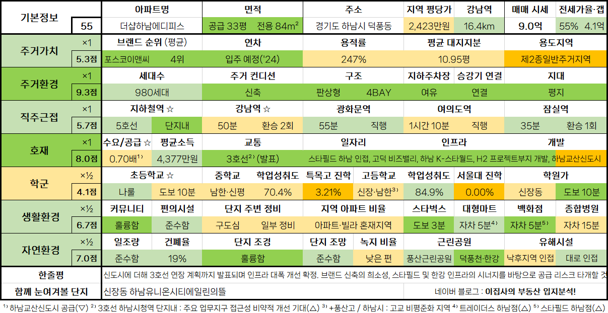 - 신도시에 더해 3호선 연장 계획까지 발표되며 인프라 대폭 개선 확정. 브랜드 신축의 희소성, 스타필드 및 한강 인프라의 시너지를 바탕으로 공급 리스크 타개할 것