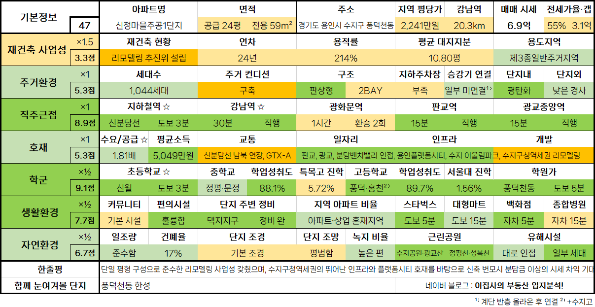 - 단일 평형 구성으로 준수한 리모델링 사업성 갖췄으며, 수지구청역세권의 뛰어난 인프라와 플랫폼시티 호재를 바탕으로 신축 변모시 분담금 이상의 시세 차익 기대