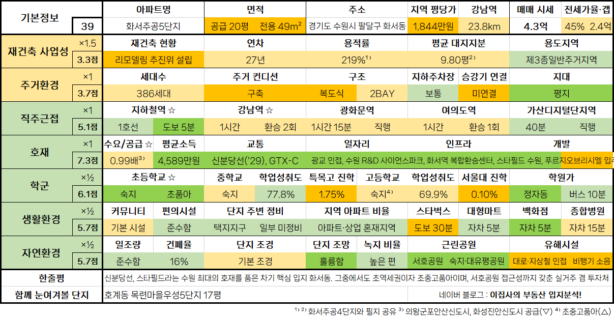 - 신분당선, 스타필드라는 수원 최대의 호재를 품은 차기 핵심 입지 화서동. 그중에서도 초역세권이자 초중고품아이며, 서호공원 접근성까지 갖춘 실거주 겸 투자처