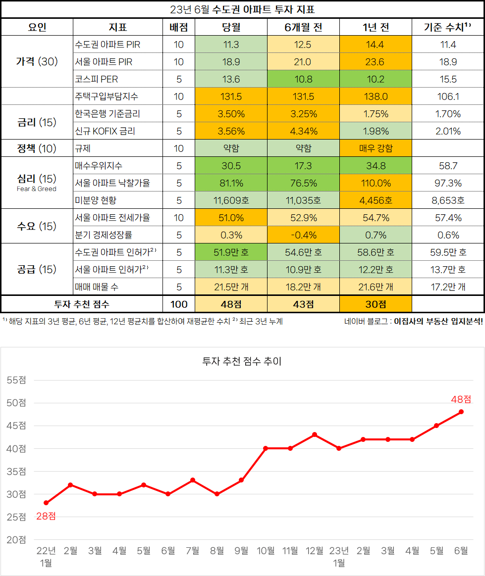 - 짙은 초록색일수록 투자 우호적, 짙은 노란색일수록 투자 비우호적 지표입니다.