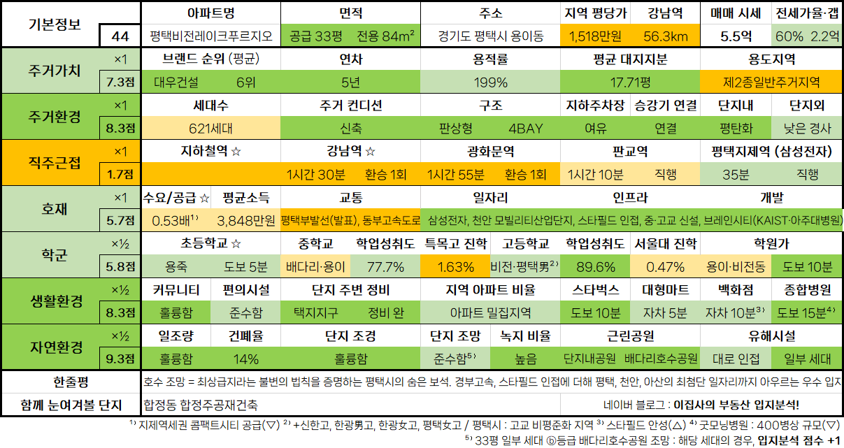 - 좋은 아파트의 기준 '브역대신평초'에 더해 삼성전자, 트레이더스, 근린공원까지 품은 최적 입지로 높은 수요 자랑함. 풍부한 교통 호재와 신도시 조성 계획은 덤