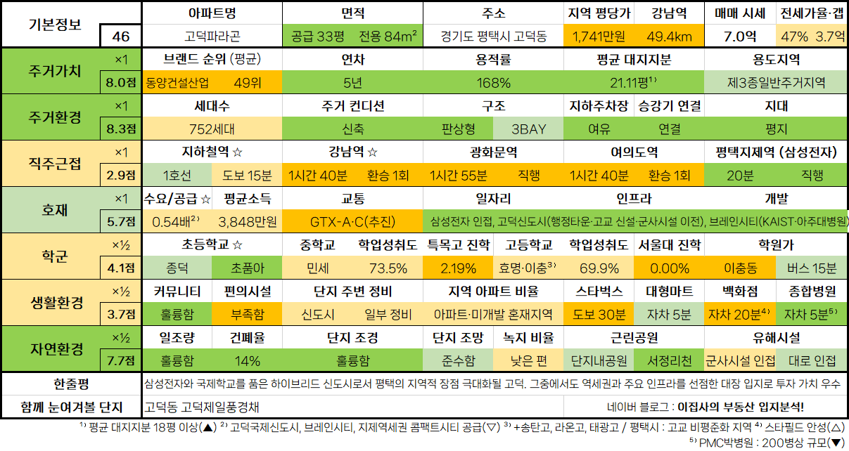 - 삼성전자와 국제학교를 품은 하이브리드 신도시로서 평택의 지역적 장점 극대화될 고덕. 그중에서도 역세권과 주요 인프라를 선점한 대장 입지로 투자 가치 우수