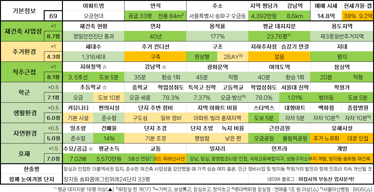 - 잠실과 인접한 더블역세권 입지, 준수한 재건축 사업성을 감안했을 때 가격 상승 여지 충분. 인근 정비사업 및 방이동 학원가의 발전과 함께 인프라 지속 개선될 것